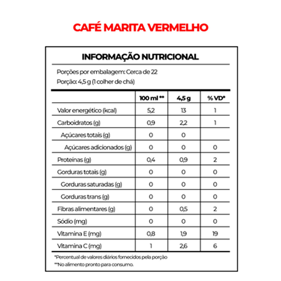 O Marita 3.0 tem sabor de café — não de química. É feito com ingredientes naturais e poucos aditivos, entregando energia limpa e gradual, com foco e saciedade sem desconforto. Fórmula sem açúcar, sem glúten e sem lactose.